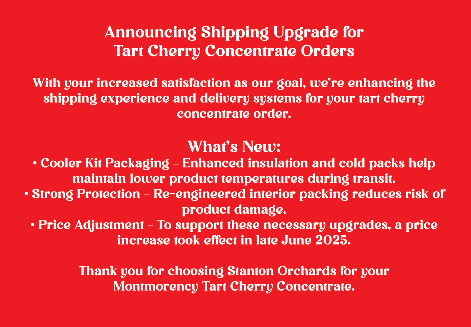 Our antioxidant-rich tart cherry concentrate comes in single bottles or cases. And try our two new products: Dried Tart Cherries and Tart Cherry Shots. We're here to help you and your family live your best and healthiest lives. See what scientific researchers say about this tart cherry superfruits' effect on sleep, exercise, recovery, gout attacks, arthritis symptoms, heart health, blood pressure and gut health: Nutrition Story. Watch our helpful videos.